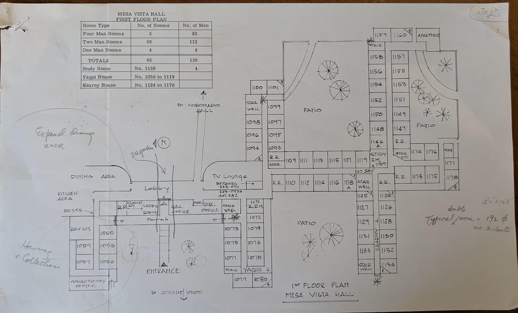 As of 1967 this was the design for the first floor of La Posada, reflecting the original design of Ernest J. Kump, lead design architect, and the alteration made by Sherman Smith.